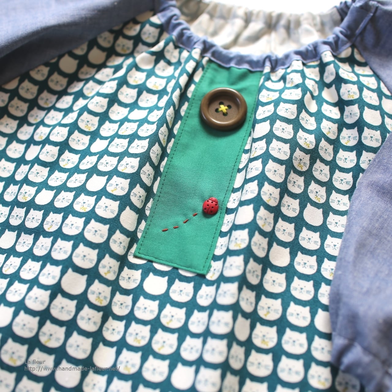 かわいい猫柄とダンガリー生地を切り替えて制作しました。