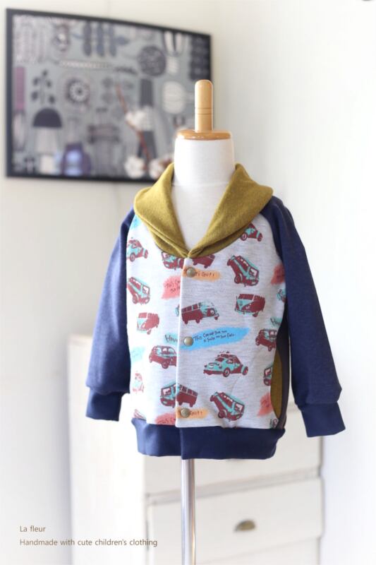 かわいいくるま柄とブラウンの裏毛ニット(トレーナー生地)、ネイビーの裏起毛ニット(トレーナー生地)を使用しています。