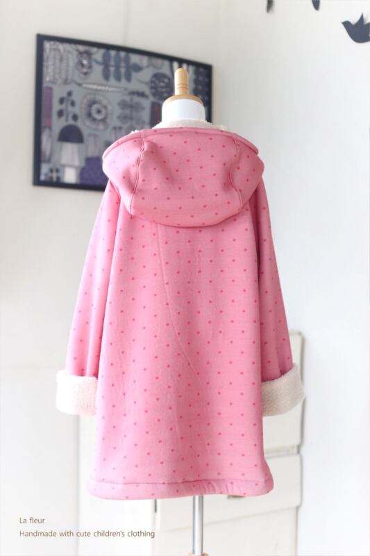 ピンクドット柄の綿ニットとボアの生地で作ったガウンコートです。
