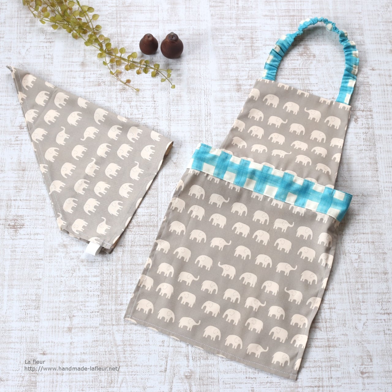 【100-120】キッズエプロン・三角巾セット ぞう×水色チェック 男の子用/La fleur